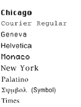 The following fonts are available for Macintosh System 7; they are displayed in Figure D-2.